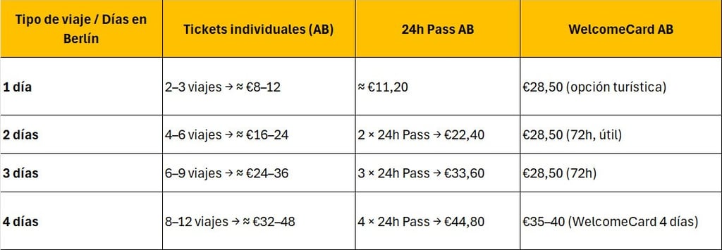 ✅ Para estancias cortas de turismo, los billetes de 24 h o la Berlin WelcomeCard suelen ser más económicos y cómodos.